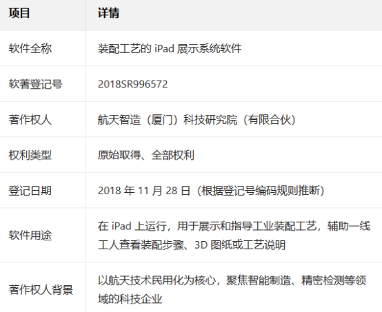 重磅消息!航天智造(廈門)研究院斬獲裝配工藝的iPad系統(tǒng)軟著