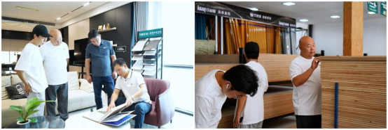 隨后,一行人前往旺德府工業(yè)園,參觀品牌自有工廠。在生產(chǎn)車間,大家通過觀木紋辨真?zhèn)?、觸板材測質(zhì)感、聞膠體驗環(huán)保的沉浸式交互,深度觸摸品質(zhì)內(nèi)核。