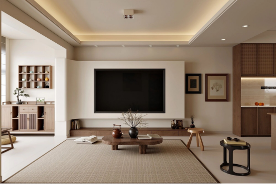 客廳電視柜:和墻面齊平的“懸浮式柜體”,把電視嵌入留白區(qū),下方做木質地臺代替?zhèn)鹘y(tǒng)電視柜,既藏了收納,又讓視覺輕盈不壓層高。