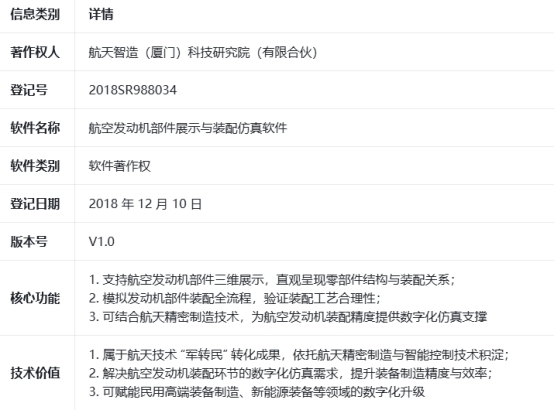 憑借在航空航天智能制造領(lǐng)域的持續(xù)深耕,技術(shù)成果轉(zhuǎn)化再迎新突破。近日,航天智造(廈門)科技研究院(有限合伙)正式完成對(duì)航天級(jí)發(fā)動(dòng)機(jī)部件裝配仿真軟件著作權(quán)(登記號(hào):2018SR988034)的并購(gòu),進(jìn)一步夯實(shí)了其在航空航天智能制造領(lǐng)域的技術(shù)壁壘,為航天技術(shù)“軍轉(zhuǎn)民”應(yīng)用再添核心成果。