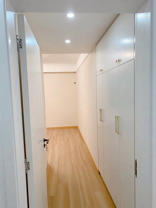 定制了一排的衣柜,可以提供非常充足的儲物空間,視覺上更大氣。頂面沒有選擇安裝吊頂,僅僅走了一圈石膏線條,看著也很有空間感。衣柜門沒有其他的造型,顯得比較簡潔,耐看,不會給人壓抑感。選擇白色,特別干凈。