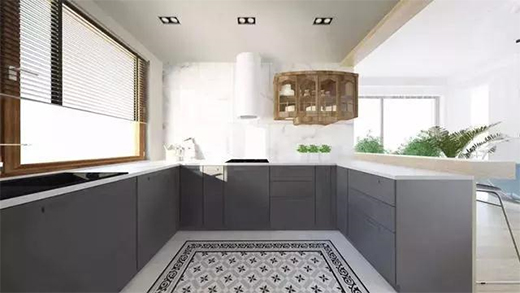 廚房照明主要以功能性為主,大多將燈具安置在操作臺的上方,或者吊柜底部,用筒燈、射燈、燈帶等提供集中照明,光源上選擇冷色光,更加方便平時的廚房操作。