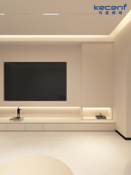 KECENT可圣照明燈光設(shè)計團隊在處理這個方案時,非常謹(jǐn)慎地將業(yè)主的實際需求及生活日常習(xí)慣放在首要考慮位置。在斟酌客廳燈光設(shè)計時,考慮到業(yè)主有收藏藝術(shù)品擺件的興趣愛好,于是給電視柜做了巧妙的燈光氛圍處理,特意安裝上線條燈點亮這個小區(qū)域,趕走昏暗與壓抑,讓這里一躍成為藝術(shù)收藏品展區(qū)。
