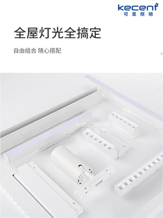 KECENT可圣照明的這款白色磁吸軌道燈,擁有磁吸萬向射燈、折疊格柵射燈、條形格柵射燈、條形泛光燈等多類選擇,可滿足不同空間的照明需求。而在本案例中,就采用了條形格柵射燈和條形泛光燈兩類磁吸燈,主要服務(wù)于空間的基礎(chǔ)照明。