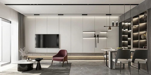 簡(jiǎn)潔的白色電視背景墻一直延伸至玄關(guān)處,沒(méi)有復(fù)雜的裝飾,只有現(xiàn)代感十足的線條設(shè)計(jì),使整個(gè)空間看起來(lái)更加整潔和規(guī)律。