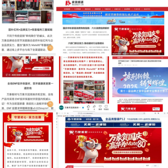 萬象品牌中秋國慶主題促銷活動實現(xiàn)全域覆蓋式傳播。通過整合多元網(wǎng)絡(luò)渠道,聯(lián)動紅網(wǎng)、新浪家居、行業(yè)權(quán)威媒體及公眾號等平臺,精準(zhǔn)觸達高價值客群,真正達成“傳播無死角,觸達有精度”的目標(biāo)。