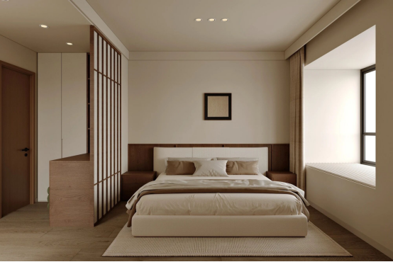 柜門:做 “一門到頂+無把手”設計,視覺上拉滿縱向延伸感,奶油白柜門和墻面幾乎融為一體,讓臥室更顯開闊;