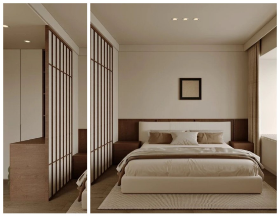 局部點睛:衣柜側邊用木質格柵屏風代替實墻,既做了空間分區(qū),又用中古標志性的格柵元素,把風格“焊”在了細節(jié)里。