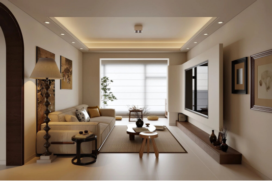 客廳電視柜:和墻面齊平的“懸浮式柜體”,把電視嵌入留白區(qū),下方做木質地臺代替?zhèn)鹘y(tǒng)電視柜,既藏了收納,又讓視覺輕盈不壓層高。