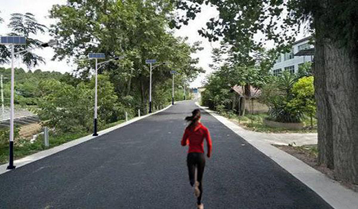 晨跑的美女和太陽陽能路燈構(gòu)成一道風(fēng)景