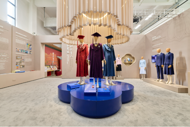 北師大未來設(shè)計學(xué)院“美育浸潤”教學(xué)成果展現(xiàn)場,展示了學(xué)院特聘教授葉錦添設(shè)計的北師大學(xué)位服