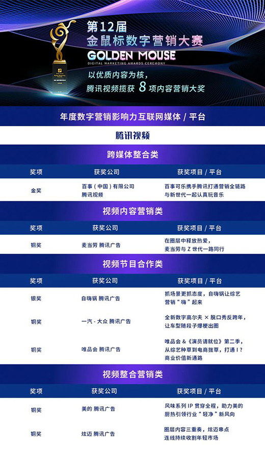 近日,在第12屆金鼠標數(shù)字營銷大賽上,騰訊視頻憑借2020年的多個經(jīng)典IP營銷案例斬獲多枚獎項,體現(xiàn)出這家視頻平臺在內(nèi)容營銷上的能力。