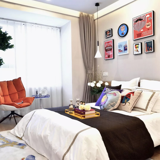 臥室氛圍自由而舒適,原木溫馨素雅的色調交織柔和的面料肌理,時尚獨特的猴子壁燈活躍空間氣質。清新的花藝裝點臥室浪漫氣質。