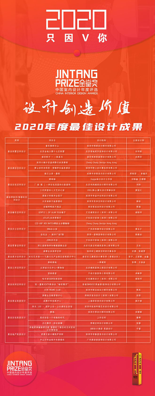 2021年3月20日晚,設(shè)計(jì)V紀(jì)元·金堂獎(jiǎng)2020-2021年度品牌盛典之夜暨2020年度金堂獎(jiǎng)最佳頒獎(jiǎng)典禮盛大舉行,在匯聚中國(guó)設(shè)計(jì)界精英的金堂獎(jiǎng)舞臺(tái)現(xiàn)場(chǎng),正式揭曉2020年度金堂獎(jiǎng)最佳設(shè)計(jì)成果。獲獎(jiǎng)設(shè)計(jì)師代表榮耀登臺(tái),享受他們的殊榮!在2020年金堂獎(jiǎng)·中國(guó)室內(nèi)設(shè)計(jì)年度評(píng)選中,共有4240件作品正式參評(píng);經(jīng)評(píng)選,共有500件作品脫穎而出,成為金堂獎(jiǎng)2020年度杰出設(shè)計(jì)作品成果;最終經(jīng)金堂獎(jiǎng)全球十四位專業(yè)評(píng)委的認(rèn)真評(píng)審,最終評(píng)選出33件作品榮膺2020年度金堂獎(jiǎng)最佳設(shè)計(jì),其中24件空間類最佳作品設(shè)計(jì),9件軟裝類最佳作品設(shè)計(jì)。